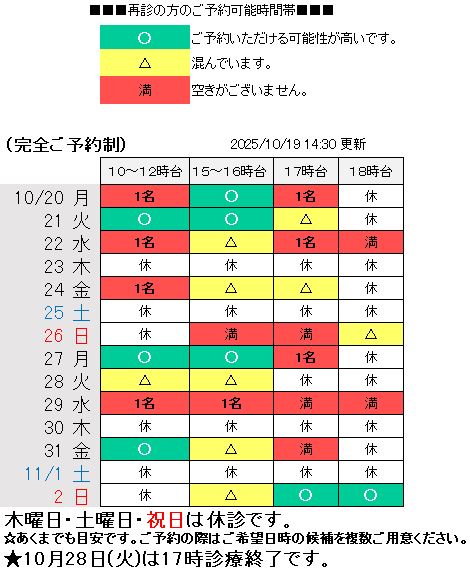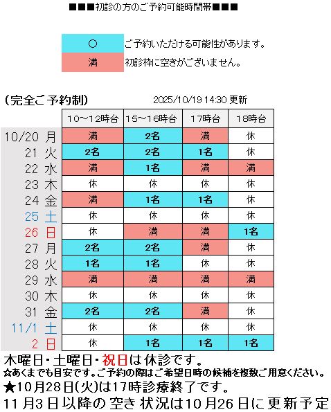 ●10月28日(火)は17時にて診療終了とさせていただきます。