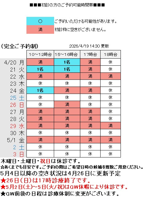●4月26日(日)の診療は17時終了となります。