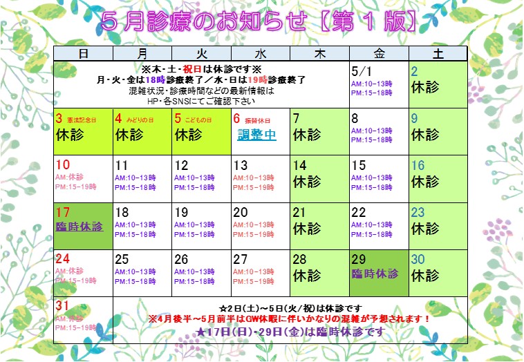 ●4月29日(水)は祝日のため休診とさせていただきます。