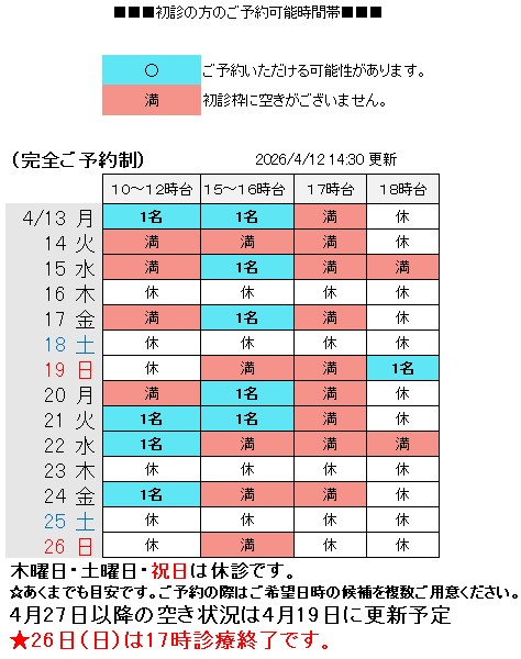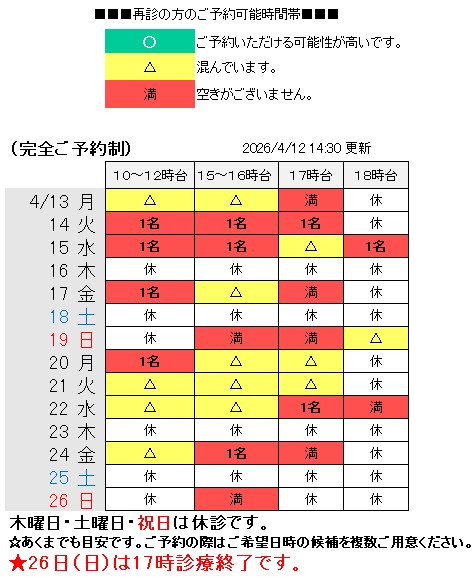 | 午前10:00~13:00 | 休 | ○ | ○ | ○ | 休 | ○ | 休 |